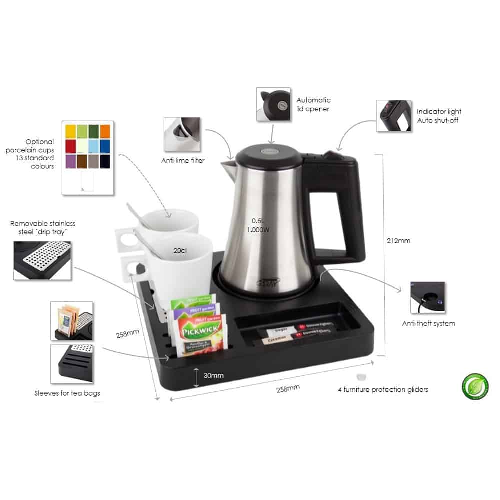Κομψό, ανθεκτικό και εξαιρετικά μικρό μέγεθος. Αυτά είναι τα κορυφαία χαρακτηριστικά του δίσκου καλωσορίσματος SQUARE της εταιρείας B-TRAY. Πολλοί υποθέτουν ότι ο δίσκος καλωσορίσματος είναι κατασκευασμένος από μασίφ ξύλο, αλλά στην πραγματικότητα αποτελείται από υψηλής ποιότητας ABS / πλαστικό με ένα μοναδικό φινίρισμα απομίμησης ξύλου. Προσφέρει εξαιρετική αντθεκτικότητα κατά της θερμότητας, το νερό, τους λεκέδες και τις γρατζουνιές. Επιπλέον το ABS είναι λιγότερο ακριβό από το μασίφ ξύλο. Ένα άλλο μοναδικό χαρακτηριστικό είναι το αφαιρούμενο, δοχείο σταξίματος από ανοξείδωτο ατσάλι για να χρησιμοποιούνται τα φακελάκια τσαγιού και κουτάλάκια. Εξαλείφει την ανάγκη για πιατάκια. Αυτή τη στιγμή ο δίσκος καλωσορίσματος SQUARE είναι διαθέσιμος σε μαύρο χρώμα.