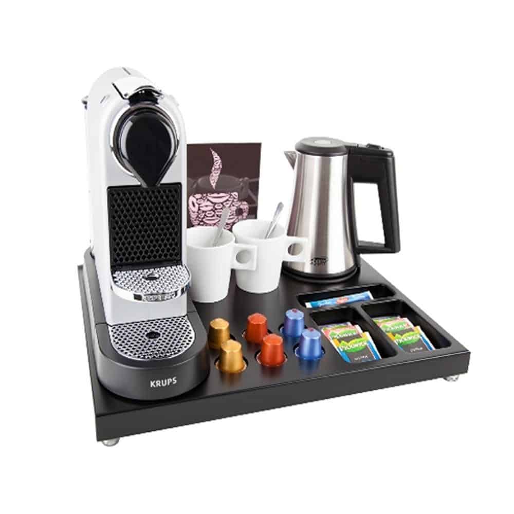 B~TRAY hospitality trays have been specifically developed to ensure your guests have a pleasant stay in your hotel. With a B~TRAY welcome tray in your hotel rooms, your guests can enjoy various flavours of tea or make their own cup of coffee using a unique tray that gives them a luxurious sensation. The special design gives your hotel rooms a distinctive touch and its high-end materials make it an indispensable feature for every hotel.