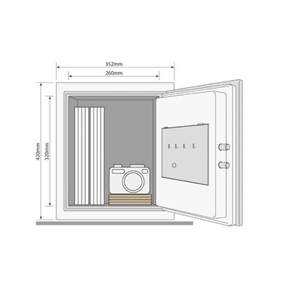 The Large sized safe is large enough to fit standing A4 papers and small binders. It can be a storage of jewelry, passports and certificates from fire. A removable internal shelf and drawer allows you to organise the safe.