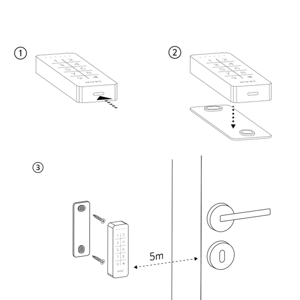 Ανοίξτε την θήκη του πληκτρολογίου Nuki πιέζοντας απαλά την πίσω πλάκα. Στη συνέχεια, χρησιμοποιήστε το υλικό τοποθέτησης για να στερεώσετε την πίσω πλάκα στον τοίχο του σπιτιού σας, η απόσταση από την πόρτα να μην ξεπερνάει τα 5μέτρα